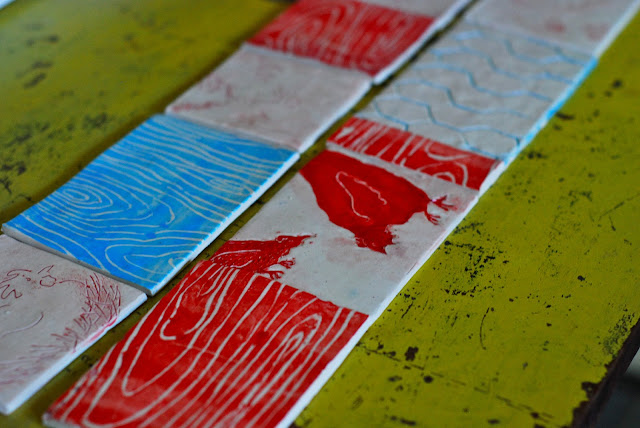 As promised, here are my chicken tiles. I'm planning to install them on a beam that spans the length of the run from the door to the coop. There's a lot of red with some aqua accents- the faux bois and chicken wire impressions. My favorite tile isn't visible in this shot- a drawing of chicken feet!